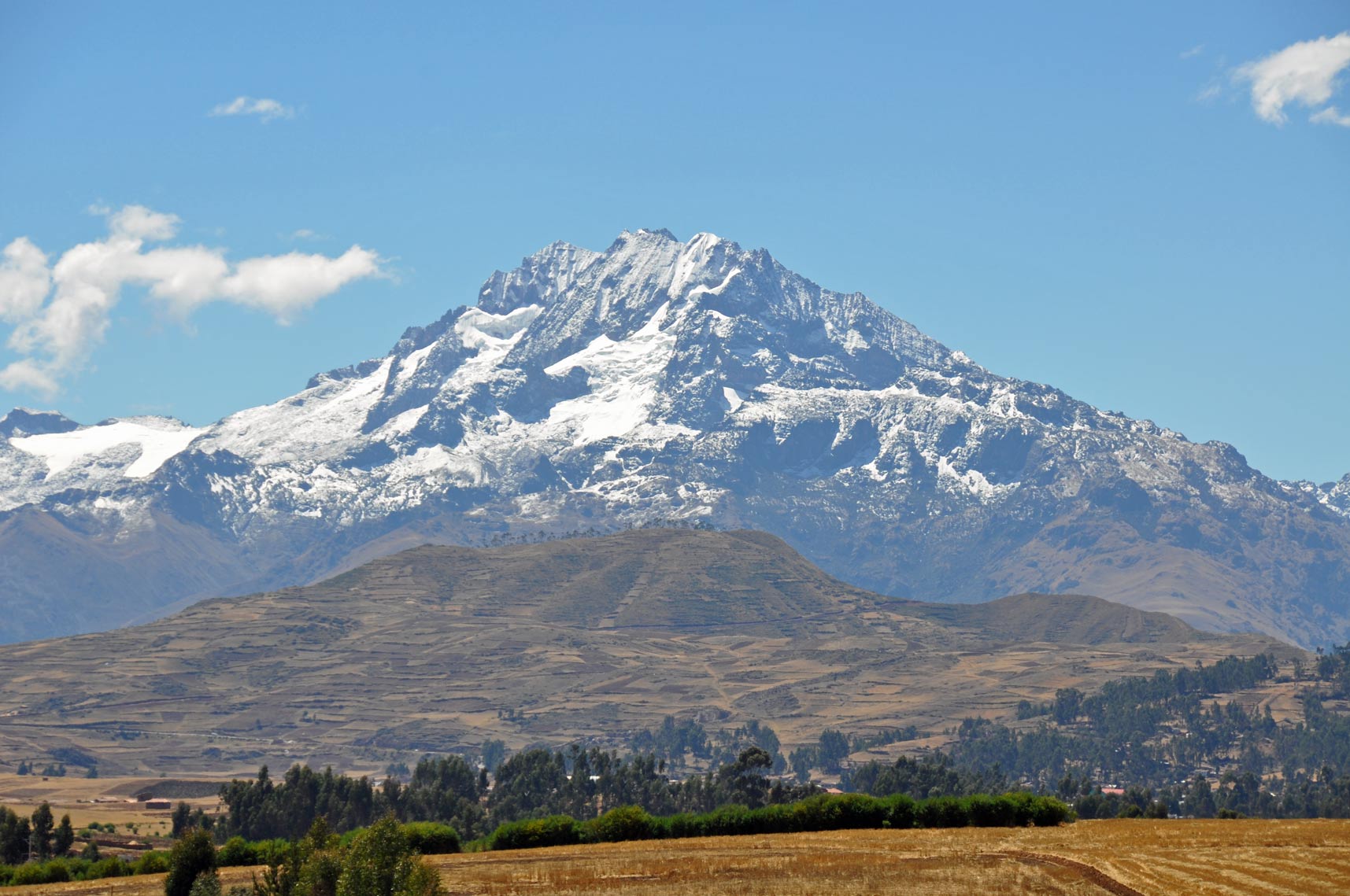 The glaciers of these mountains provide water for crops and for the supply of towns throughout the Valley, though as the world heats up, the glaciers seem to be on the retreat. The intensely cultivated valley floor is about 1 kilometre (0.62 mi) wide on average. Side valleys and agricultural terraces expand the cultivatable area, though many of the terraces are unused, either because they’re protected as part of a historic site, or because after the Spaniards the irrigation system broke down and can’t be reconstructed.