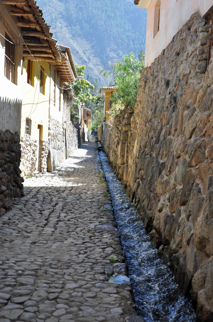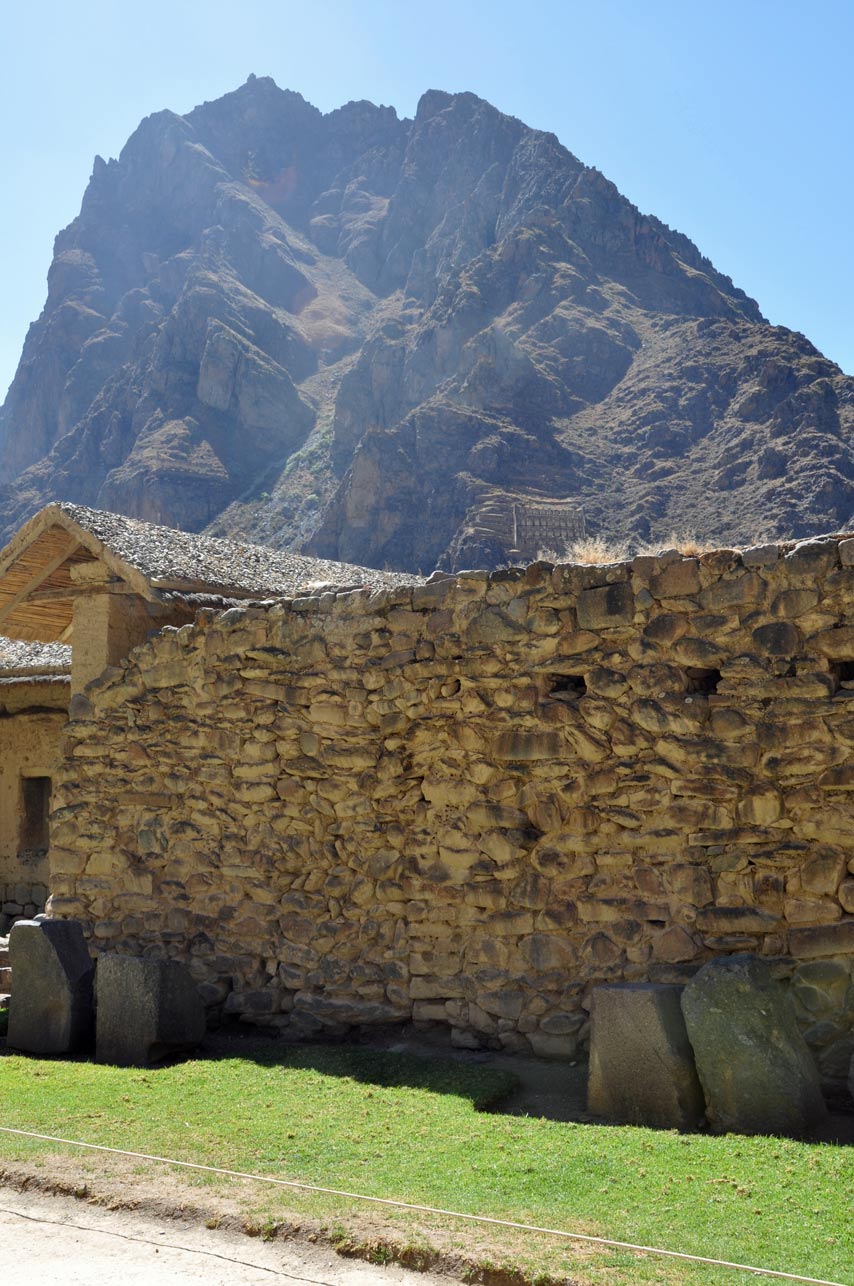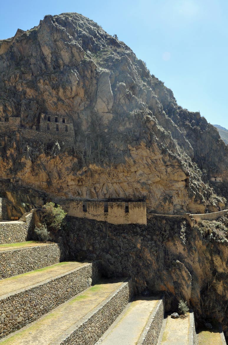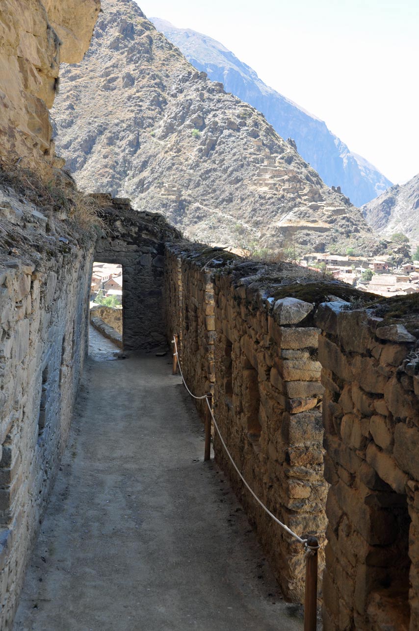A set of sunken terraces start south of Ollantaytambo’s Plaza de Armas, stretching all the way to the Urubamba River. They are about 700 meters long, 60 meters wide and up to 15 meters below the level of surrounding terraces; due to their shape they are called Callejón, the Spanish word for alley. Land inside Callejón is protected from the wind by lateral walls which also absorb solar radiation during the day and release it during the night; this creates a microclimate zone 2 to 3°C warmer than the ground above it. These conditions allowed the Incas to grow species of plants native to lower altitudes that otherwise could not have flourished at this site.