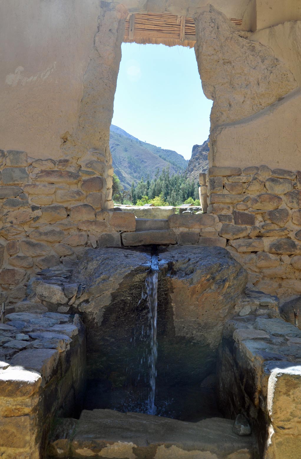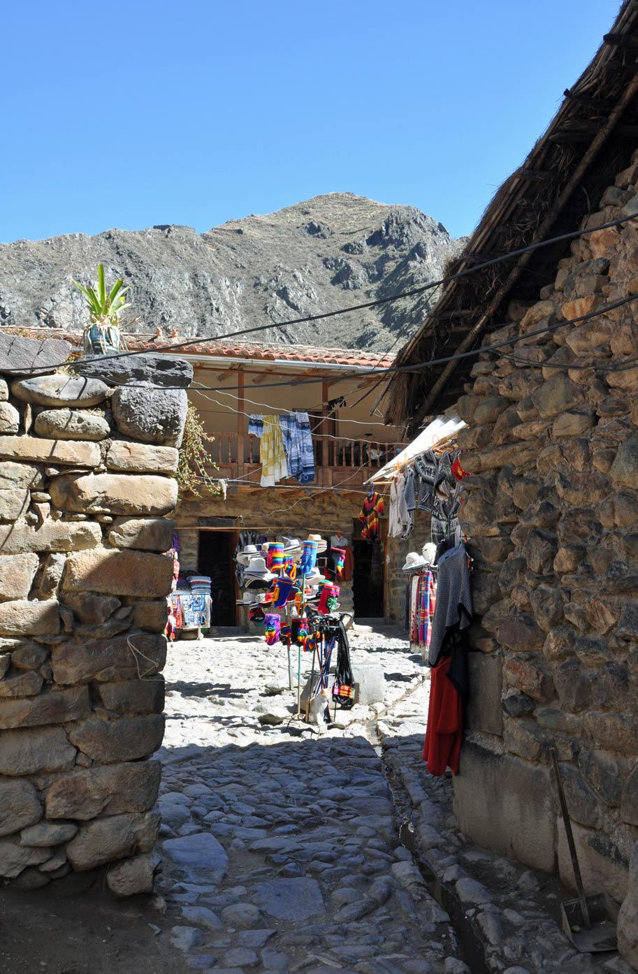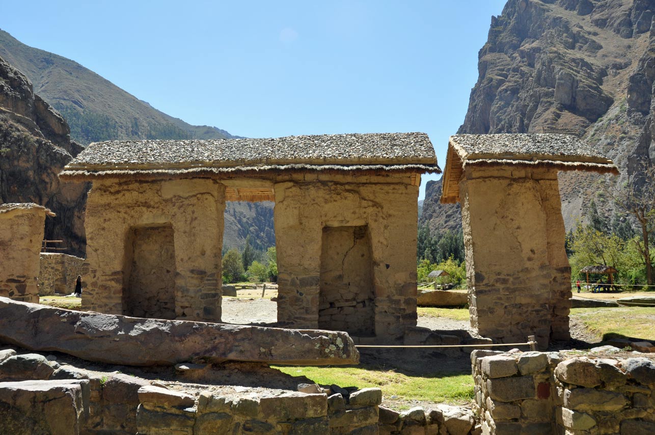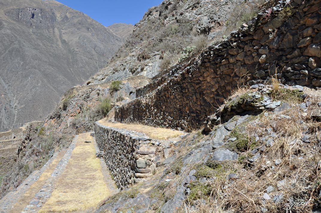 A set of sunken terraces start south of Ollantaytambo’s Plaza de Armas, stretching all the way to the Urubamba River. They are about 700 meters long, 60 meters wide and up to 15 meters below the level of surrounding terraces; due to their shape they are called Callejón, the Spanish word for alley. Land inside Callejón is protected from the wind by lateral walls which also absorb solar radiation during the day and release it during the night; this creates a microclimate zone 2 to 3°C warmer than the ground above it. These conditions allowed the Incas to grow species of plants native to lower altitudes that otherwise could not have flourished at this site.