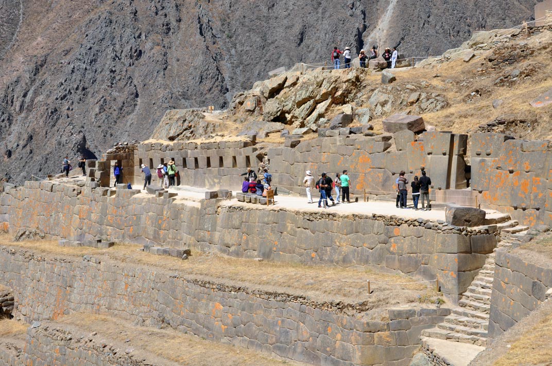 The ruins are separated along the ridge into four groups: P’isaqa, Inti Watana, Qalla Q’asa, and Kinchiraqay. Inti Watana group includes the Temple of the Sun, baths, altars, water fountains, a ceremonial platform, and an inti watana, a volcanic outcrop carved into a “hitching post for the Sun” (or Inti).