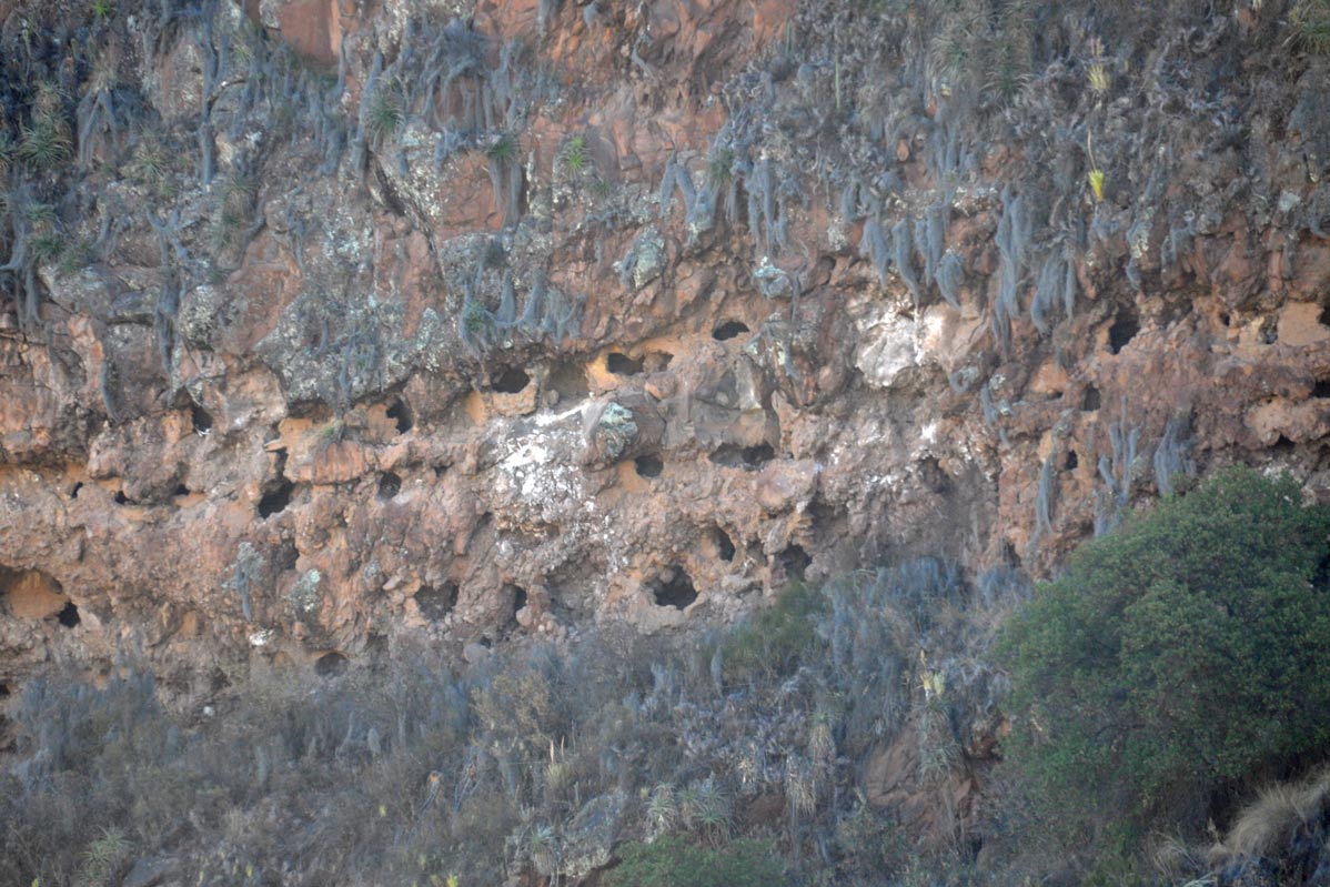 And up on the hills above there are food stores where maize and dried potatoes would be put away in the good years for the expected years of fallow during el nino etc. The potatoes at least look like the most unappetising, stones but in times of hunger they would fill you up and keep a family going. The Incas storehouses or qullqas were built out of out of fieldstones on the hills surrounding Ollantaytambo. Their location at high altitudes, where there is more wind and lower temperatures, defended their contents against decay. To enhance this effect, the Ollantaytambo qullqas feature ventilation systems. It is believed that they were used to store the production of the agricultural terraces built around the site. Grain would be poured in the windows on the uphill side of each building, then emptied out through the downhill side window.