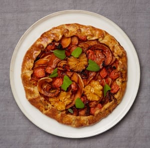 Heat the oven to 240C (220C fan)/465F/gas 9. For the crust, whisk together the first six ingredients with a good grind of pepper. Add the butter and oil, then incorporate the butter by squashing each cube between your fingers – don’t over-work it, though: you want chunks throughout the dough, so only squash it lightly. Add the water, stir to combine, then use your hands to gather the dough together – it will be quite sticky.