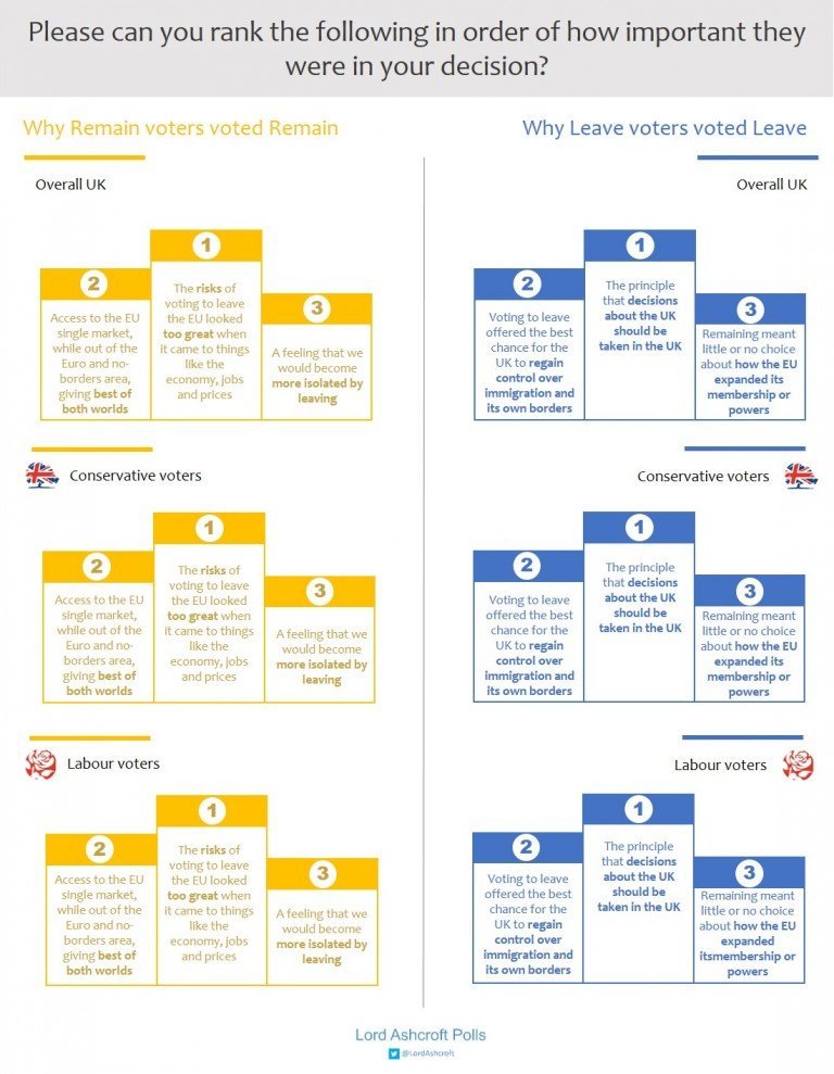 And the reasons given for voting either in or out clearly show the dichotomy between economic risk and immigration. The topics of “control” and “ability to make decisions” can easily be read with the follow up “…to keep people out”.