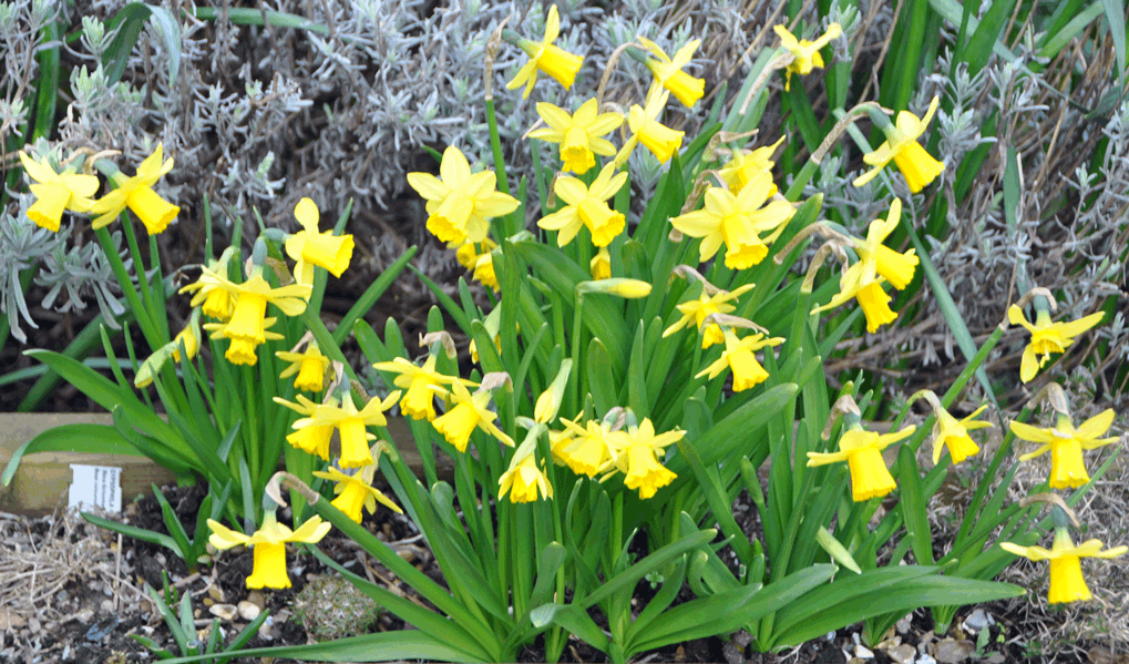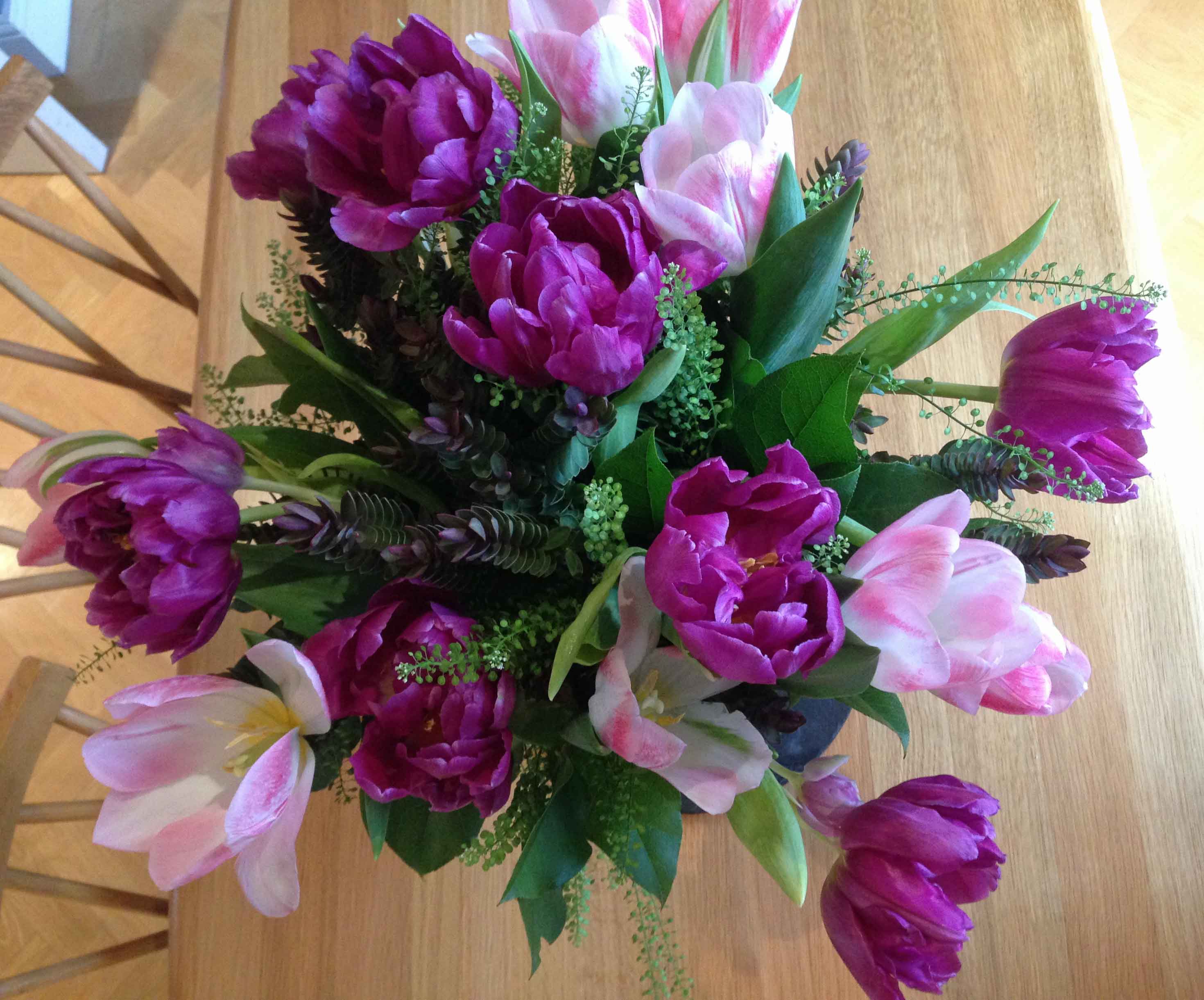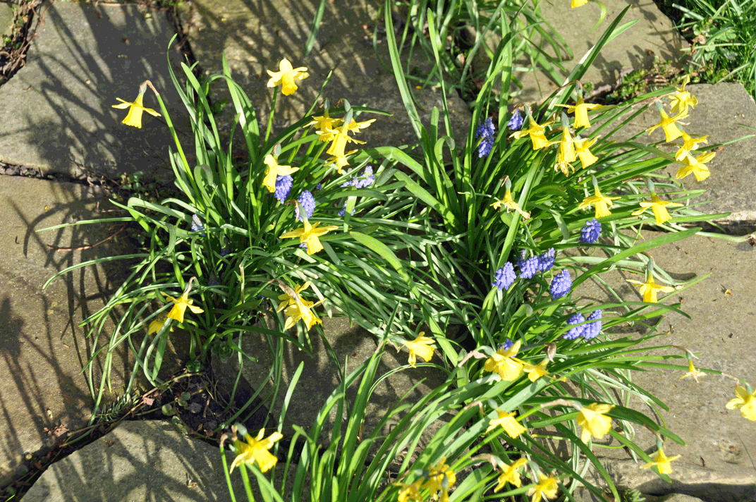 The muscari (grape hyacinths) have arrived earlier than in previous years so are underpinning the daffodils as well as the frittelaria.