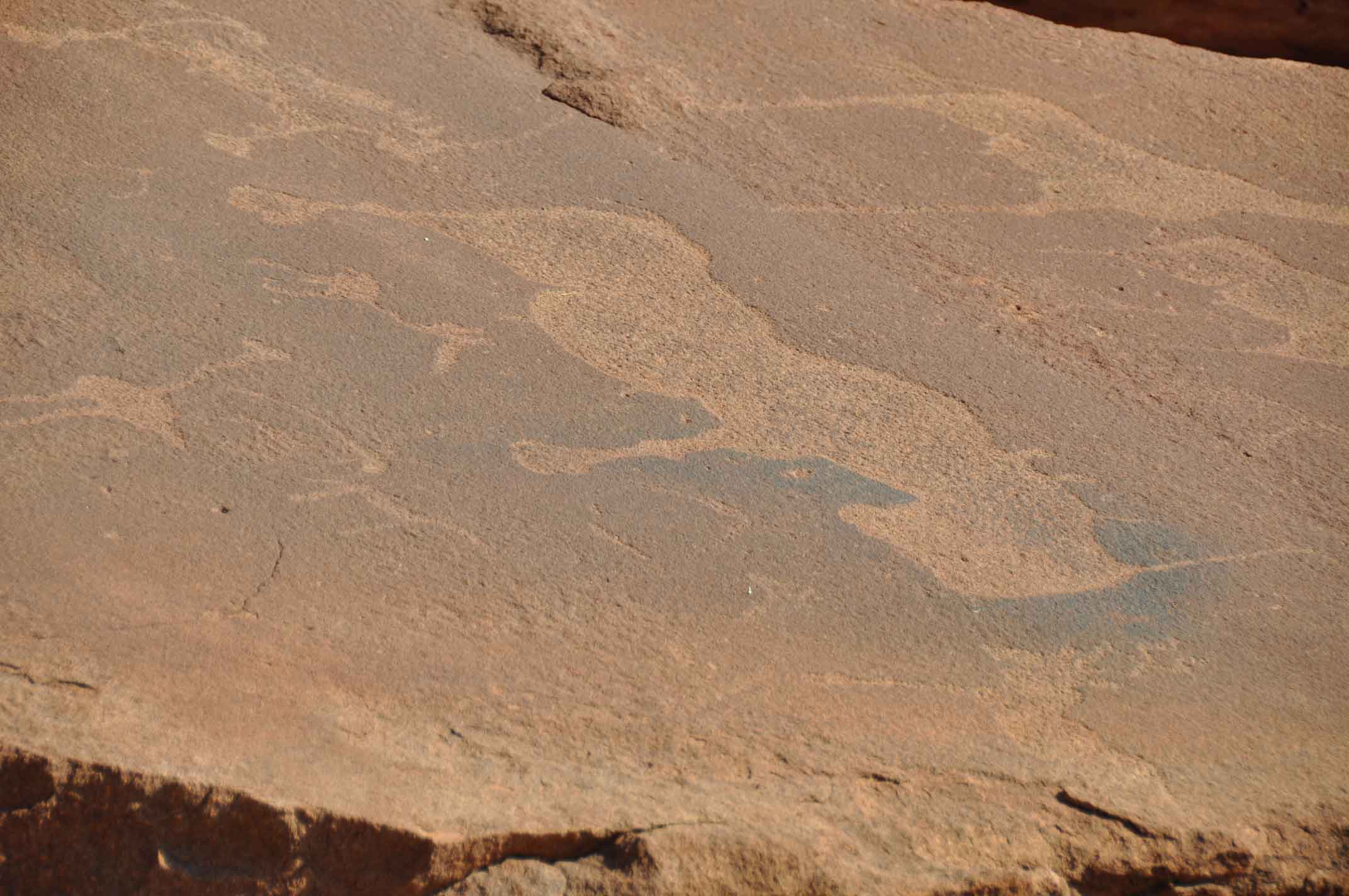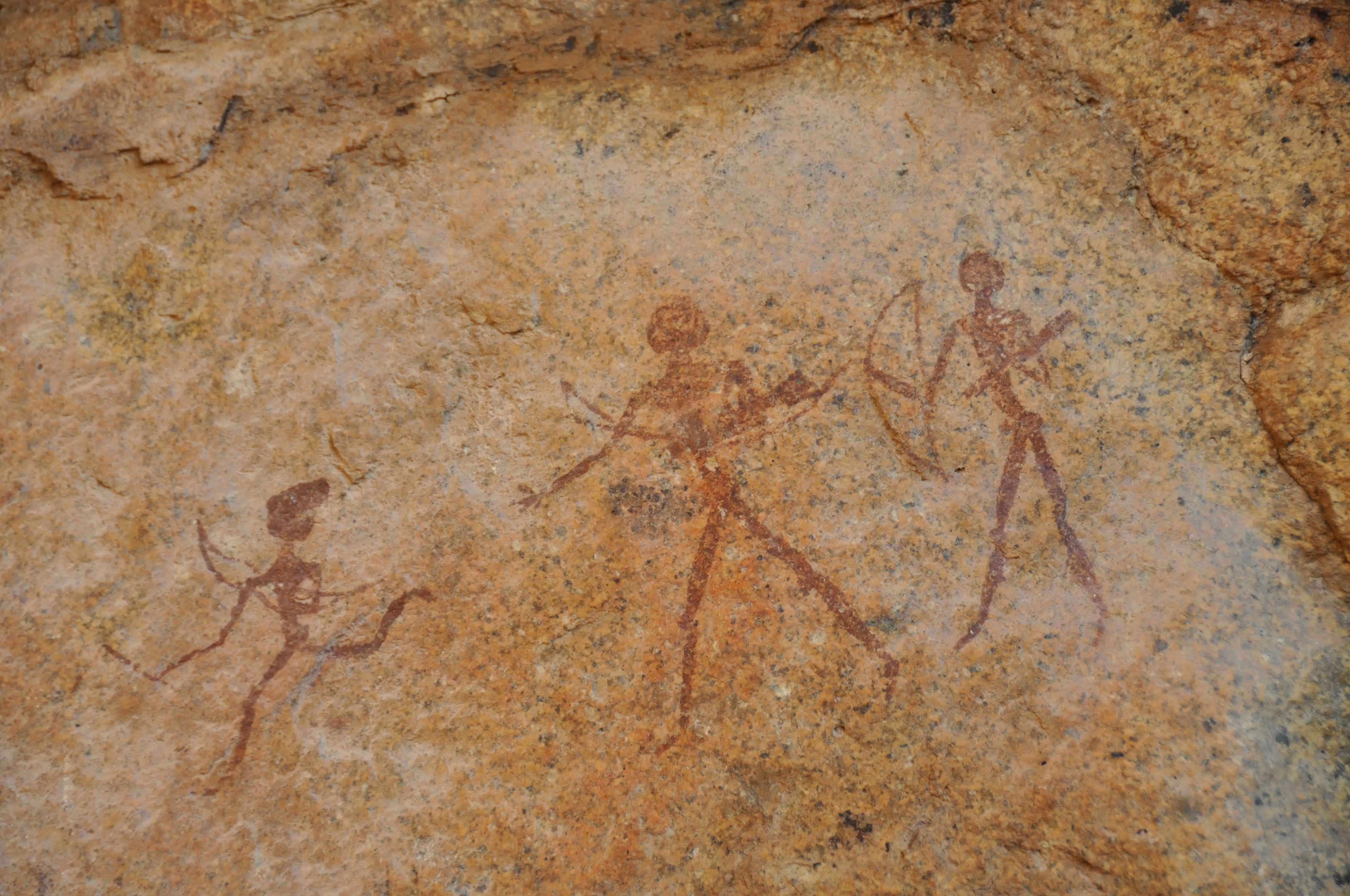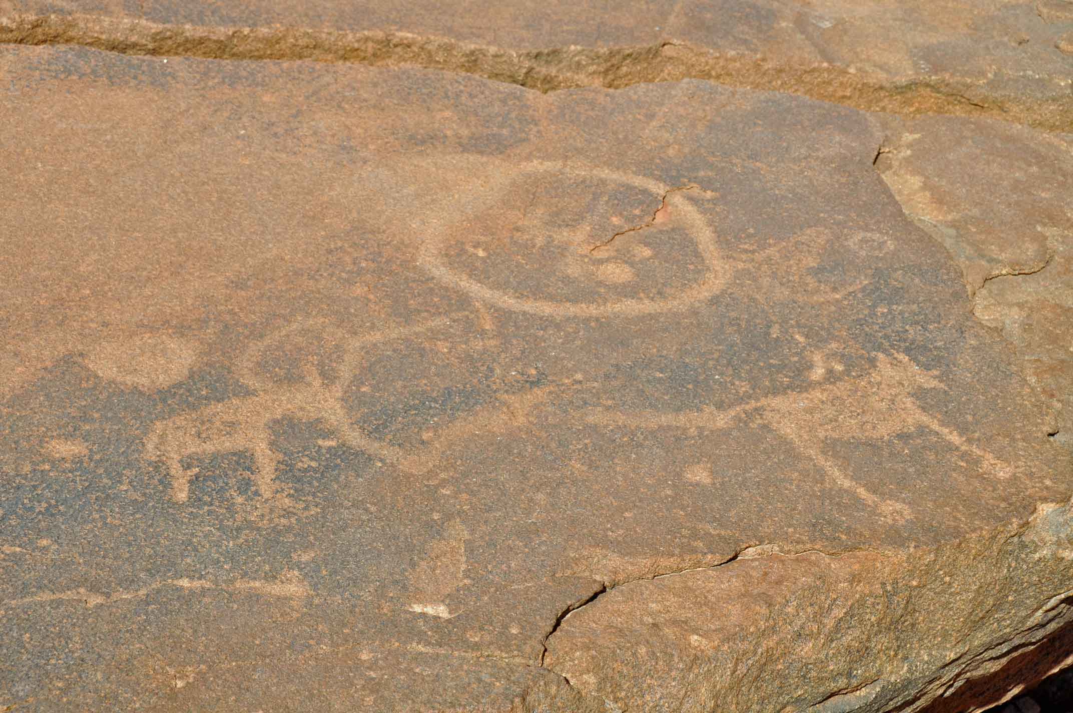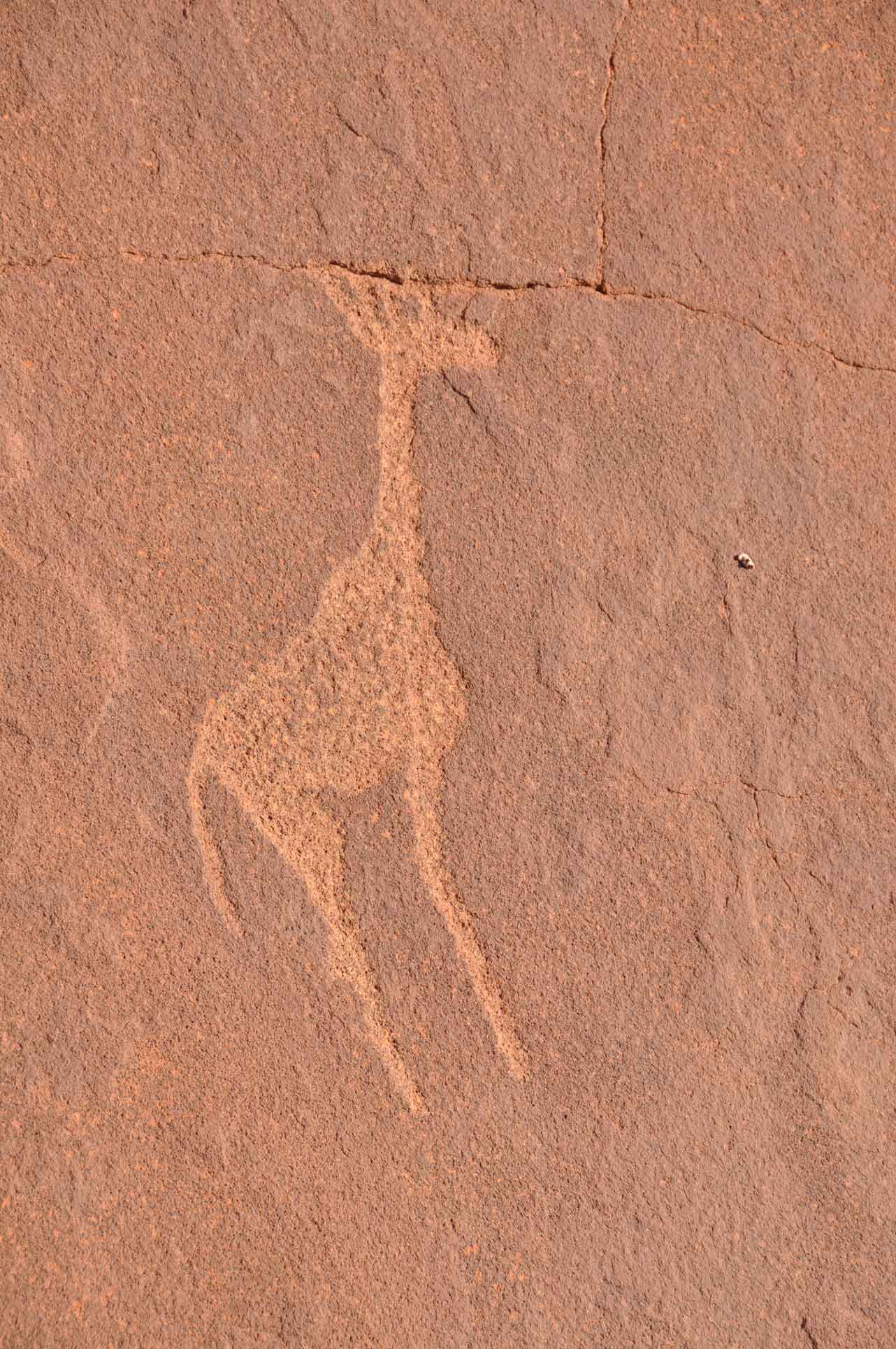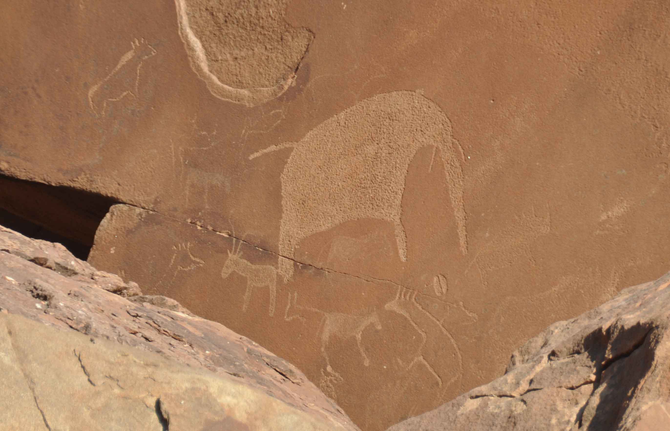 Most of these well-preserved engravings represent rhinoceros, . The site also includes elephant, ostrich and giraffe, as well as drawings of human and animal footprints, rock shelters with motifs of human figures in red ochre.