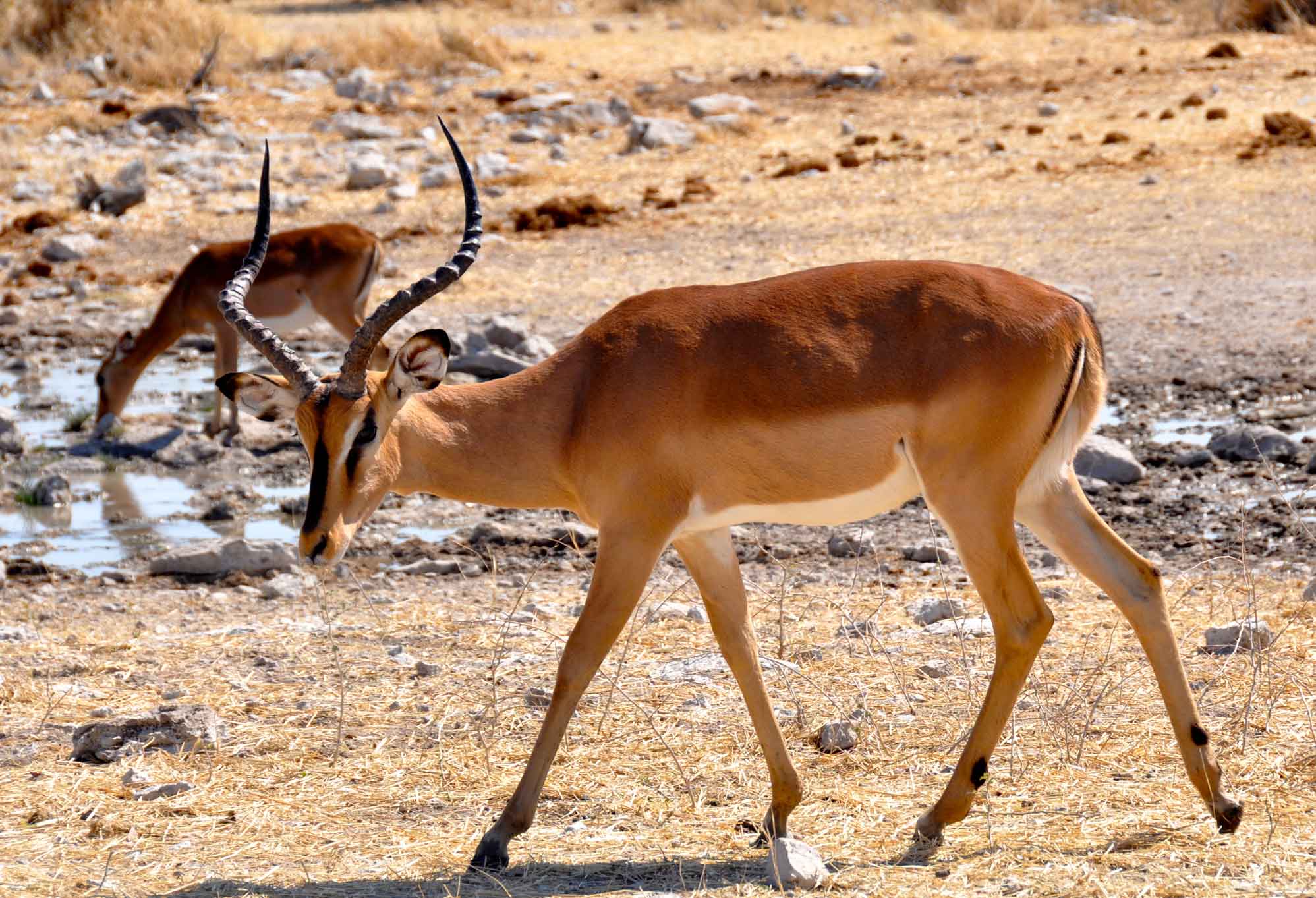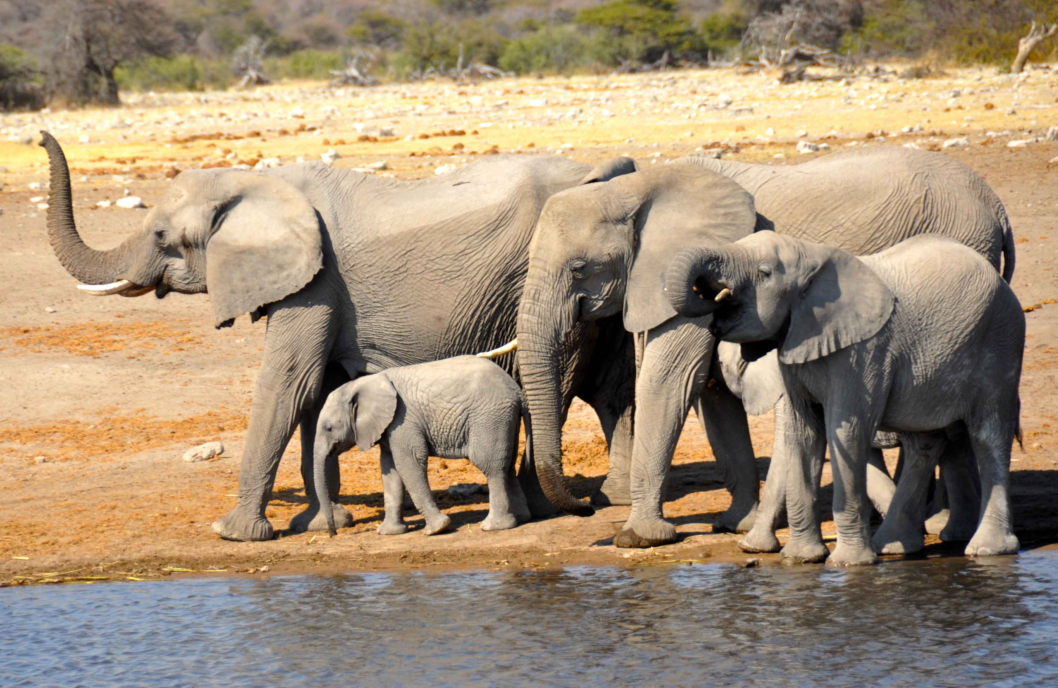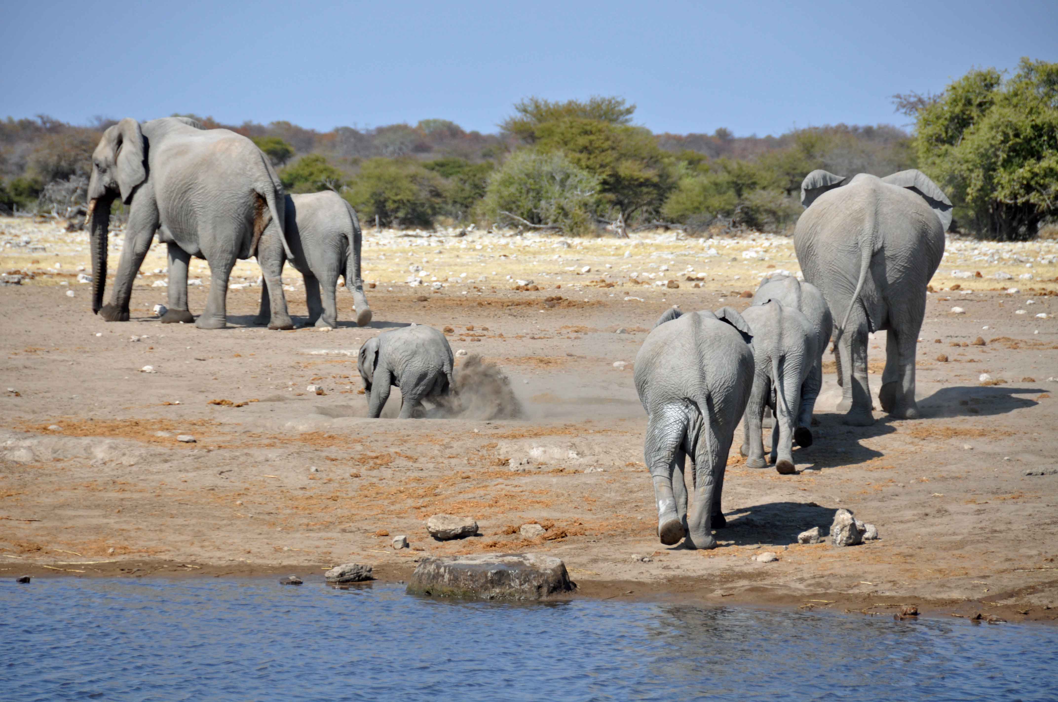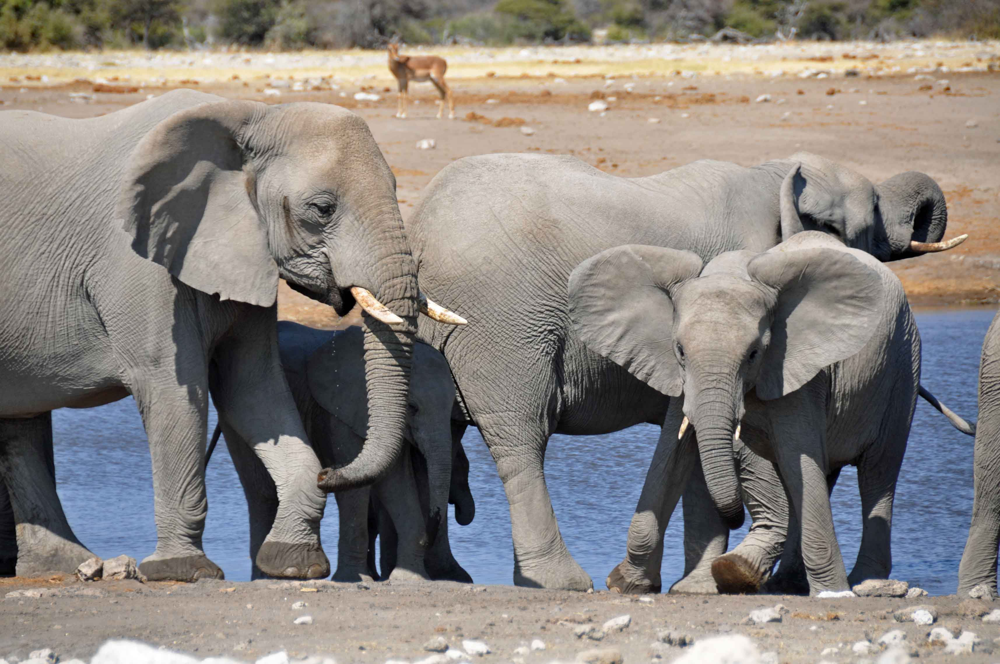 Waterholes remain even during the dryest season though, and one of the most surreal experiences has to be parking up to eat some sandwiches for lunch, only to find yourself surrounded first by elelphants and then by all of the other animals parked up waiting for the water to be free. Including the Namibian national animal