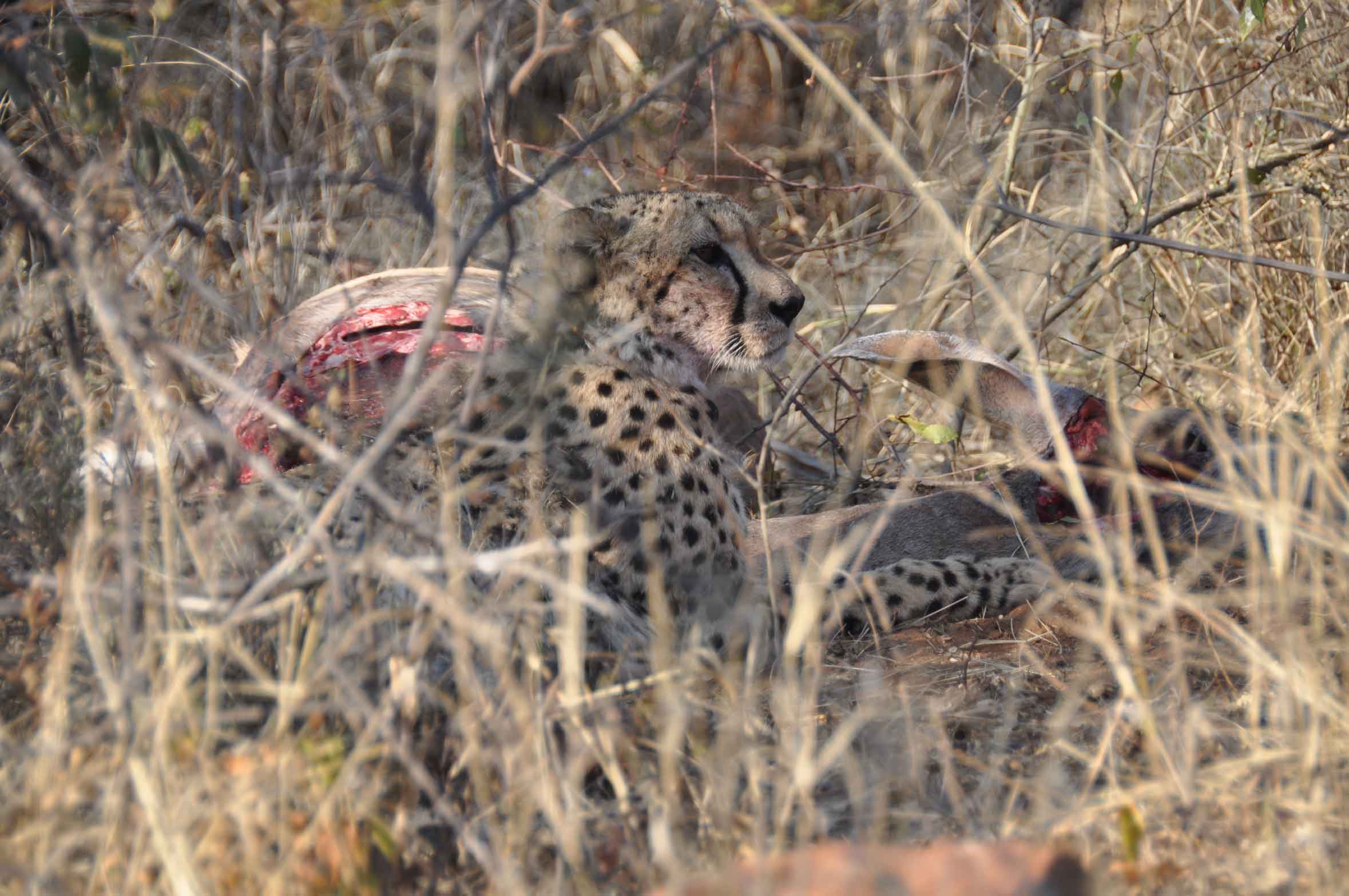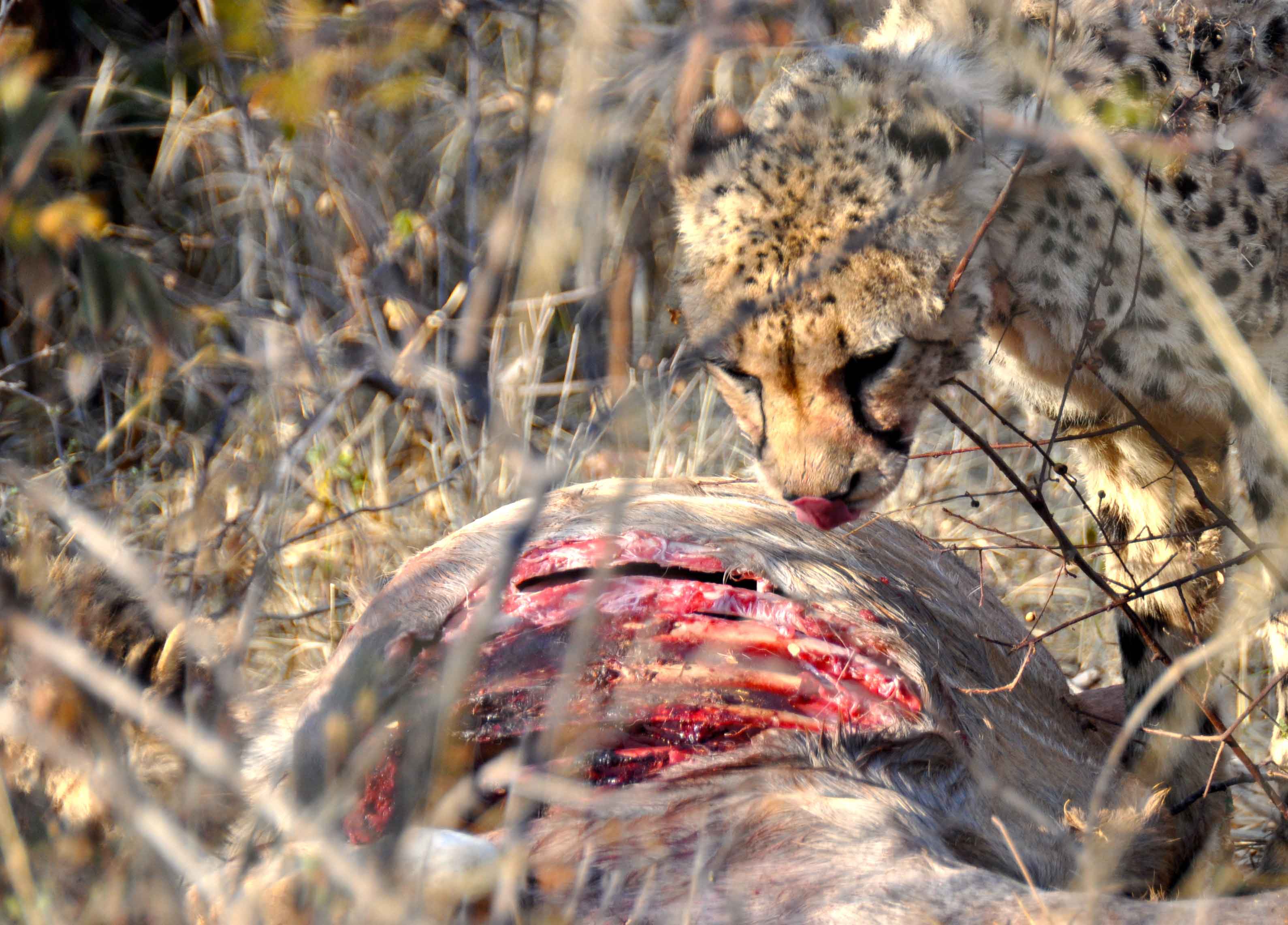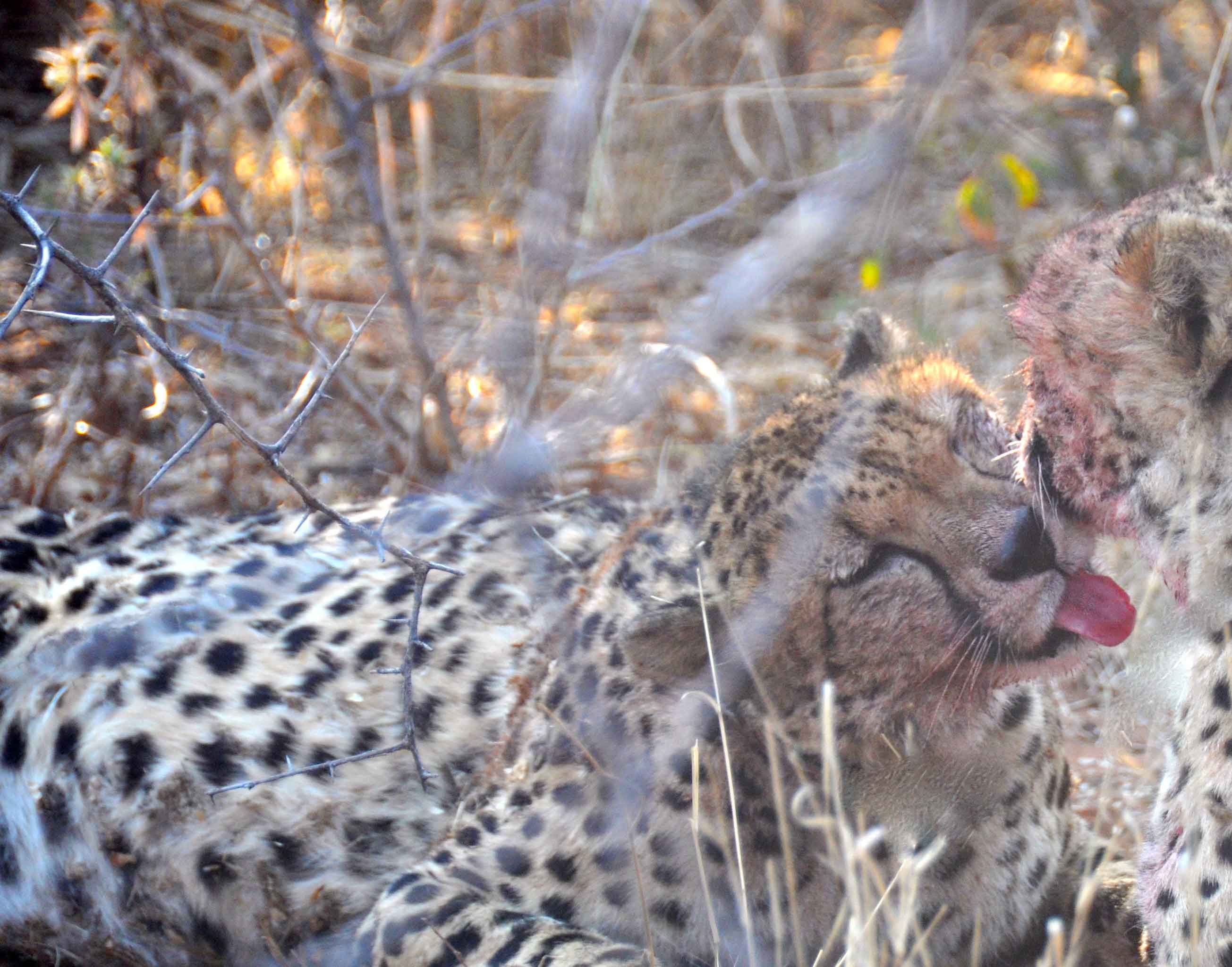 The cheetahs we found at a kill site, having already enjoyed the innards, purring and licking each other up in satisfaction.