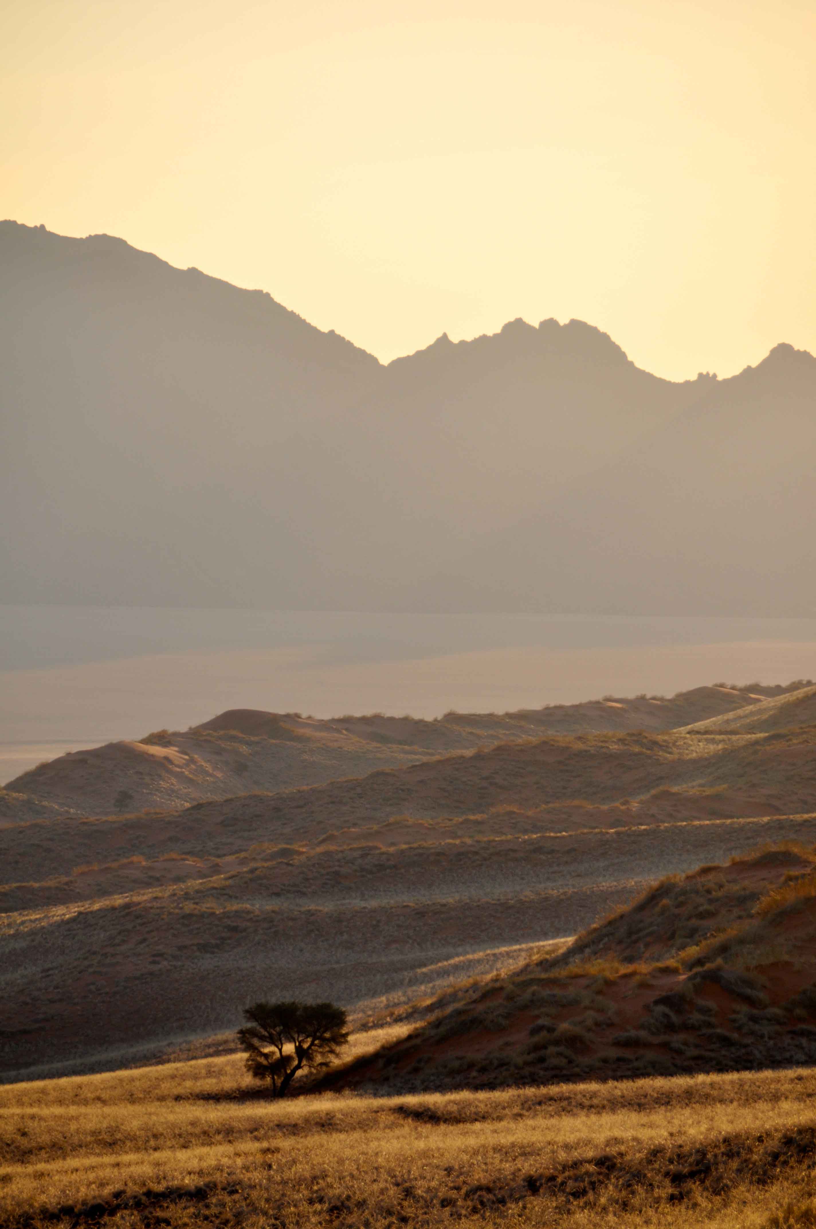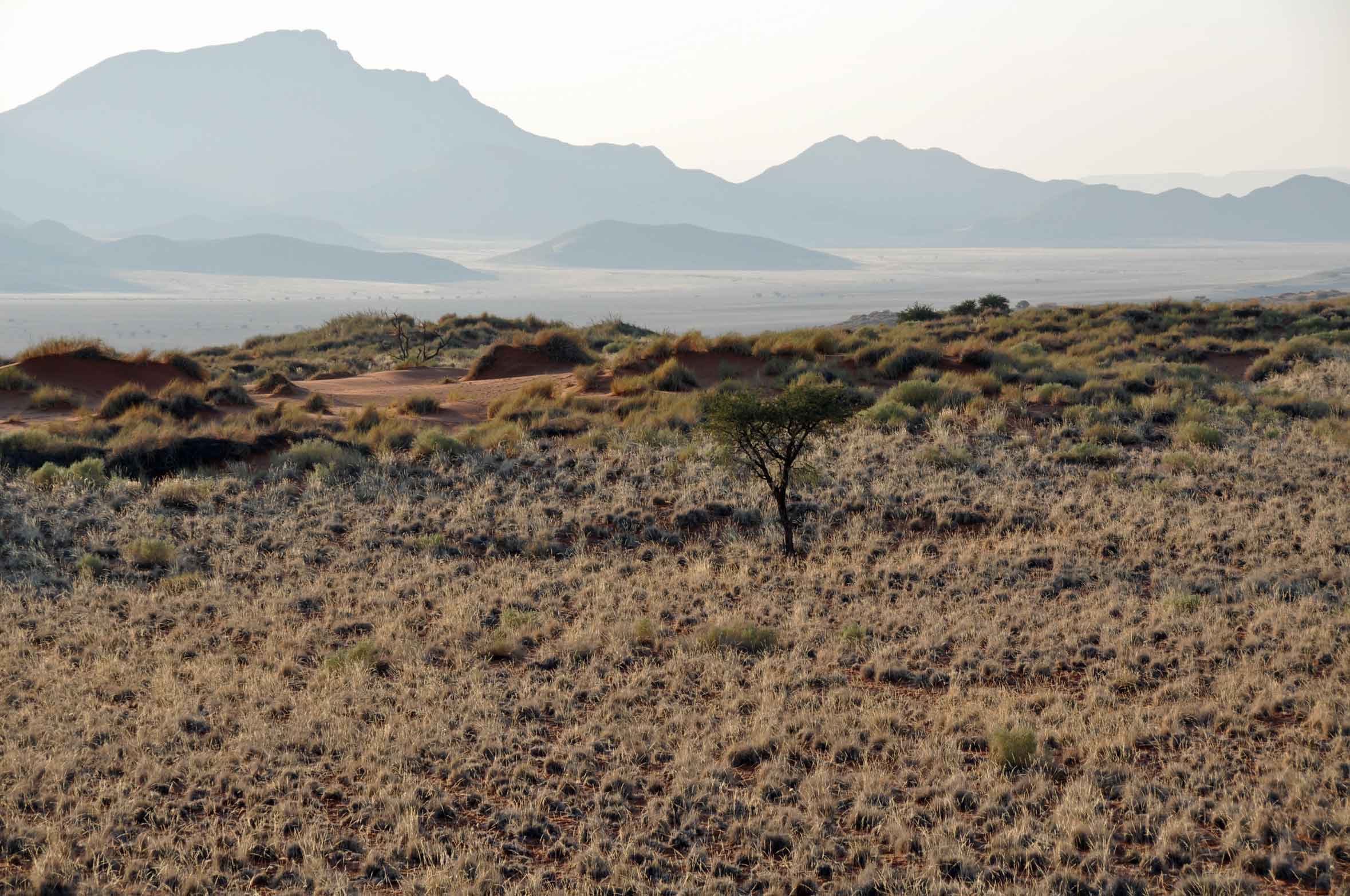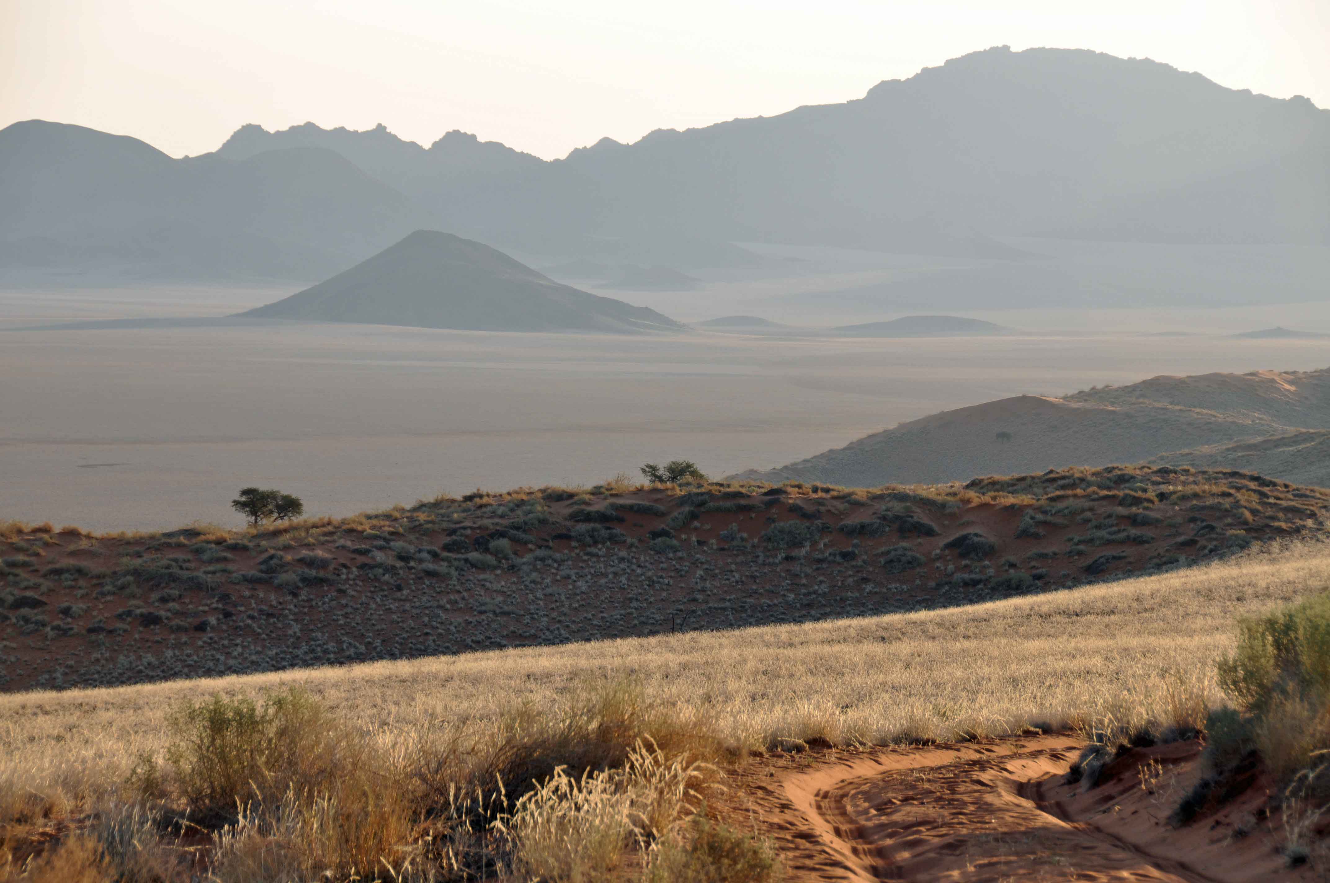 in southern Africa. Much of the precipitation is in the form of fog that rolls in from the ocean to the west. Mist in the morning or at least a general haze, made for grey and a very delicate pink colour.