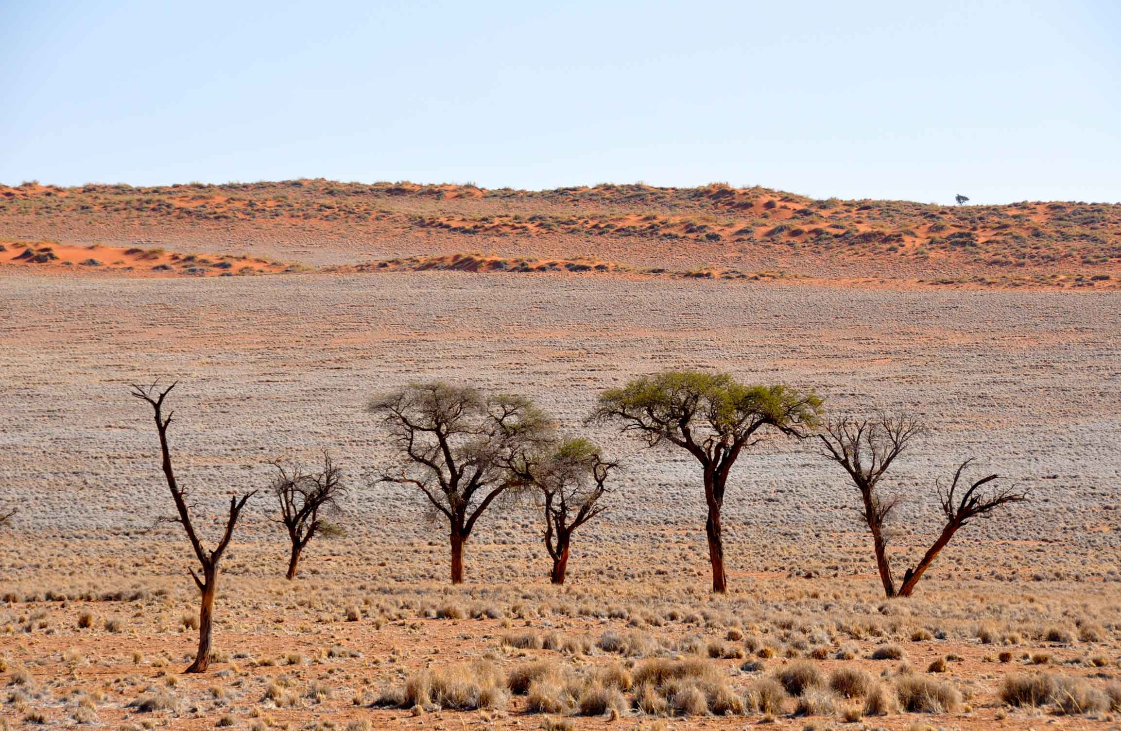 The orignial clay pan was formed after rainfall, when the Tsauchab River flooded, creating temporary shallow pools where the abundance of water allowed camel thorn trees to grow. When the climate changed, drought hit the area, and sand dunes encroached on the pan, which blocked the river from the area.